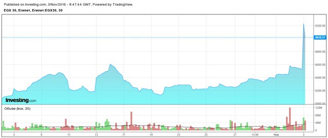 Кстати, фондовый рынок Египта отреагировал на реформу валютного рынка бурным ростом. Сначала котировки индекса EGX30 взлетели на 8%, затем немного снизились.