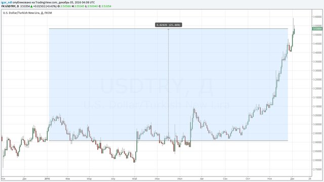 Конечно, все не совсем так, как говорит президент, все-таки мы видим сильнейшее укрепление доллара ко всем валютам, и лира со всеми турецкими проблемами, конечно, не исключение. Кроме того. с марта этого года ЦБ Турции начал цикл смягчения денежно-кредитной политики, что сделало турецкие активы менее привлекательными для финансовых спекулянтов.