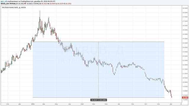 Кстати, если посмотреть на динамику турецкой лиры к российскому рублю, то здесь перевес также не в пользу турецкой валюты. Лира с начала года подешевела к рублю на 26%.