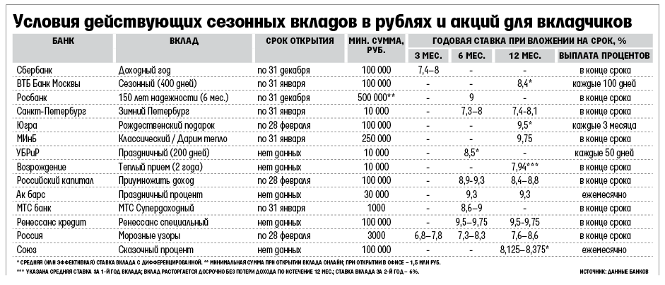 Сейчас лучшие сезонные предложения крупных банков – в пределах 9,75% годовых (см. таблицу). До 10% дотягивают «новогодние» ставки лишь у некоторых небольших и региональных банков (МБСП, «Солидарность», «Советский» и др.).