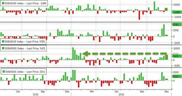 Как видно из графика, запасы в Кушинге также продолжили расти, хотя и не такими быстрыми темпами, как того ожидали участники рынка. Тем не менее динамика здесь не может не вызывать удивления.