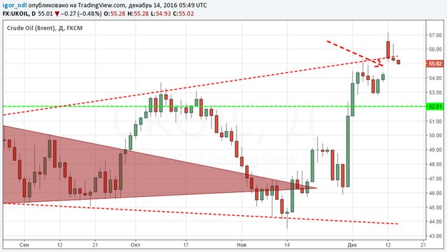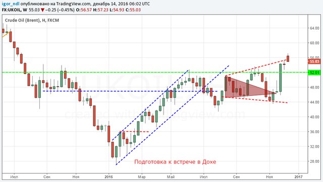 Если смотреть на график недельного фрейма, то мы видим, что до сих пор важным уровнем сопротивления выступала отметке $52, однако после решения ОПЕК этот уровень был уверенно пробит, причем движение было настолько мощным и быстрым, что сомнений здесь не остается.